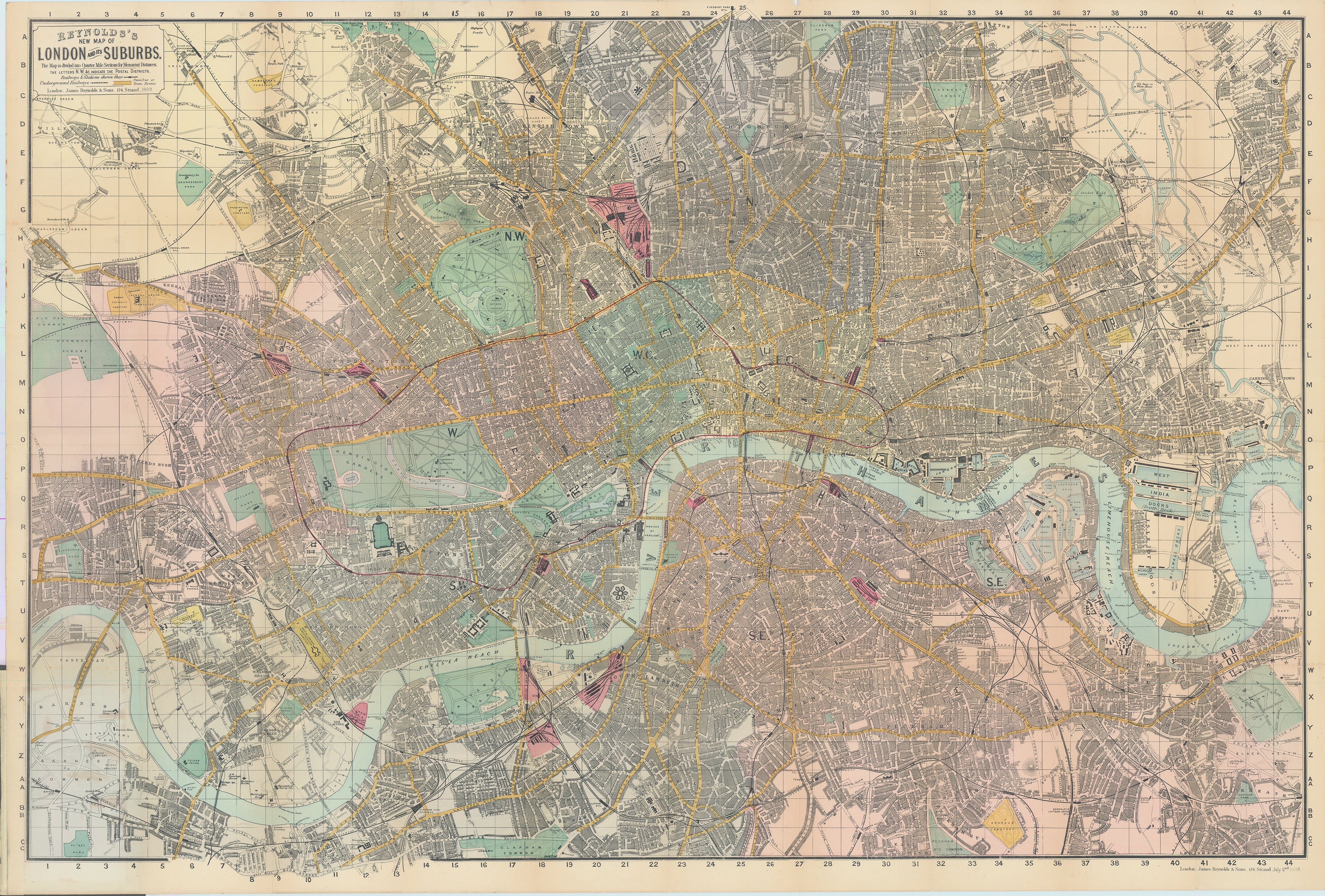 - Title: REYNOLDS'S NEW MAP OF LONDON AND ITS SUBURBS | The map is divided into Quarter Mile Sections for Measuring Distances | THE LETTERS N.W. &c INDICATE THE POSTAL DISTRICTS
