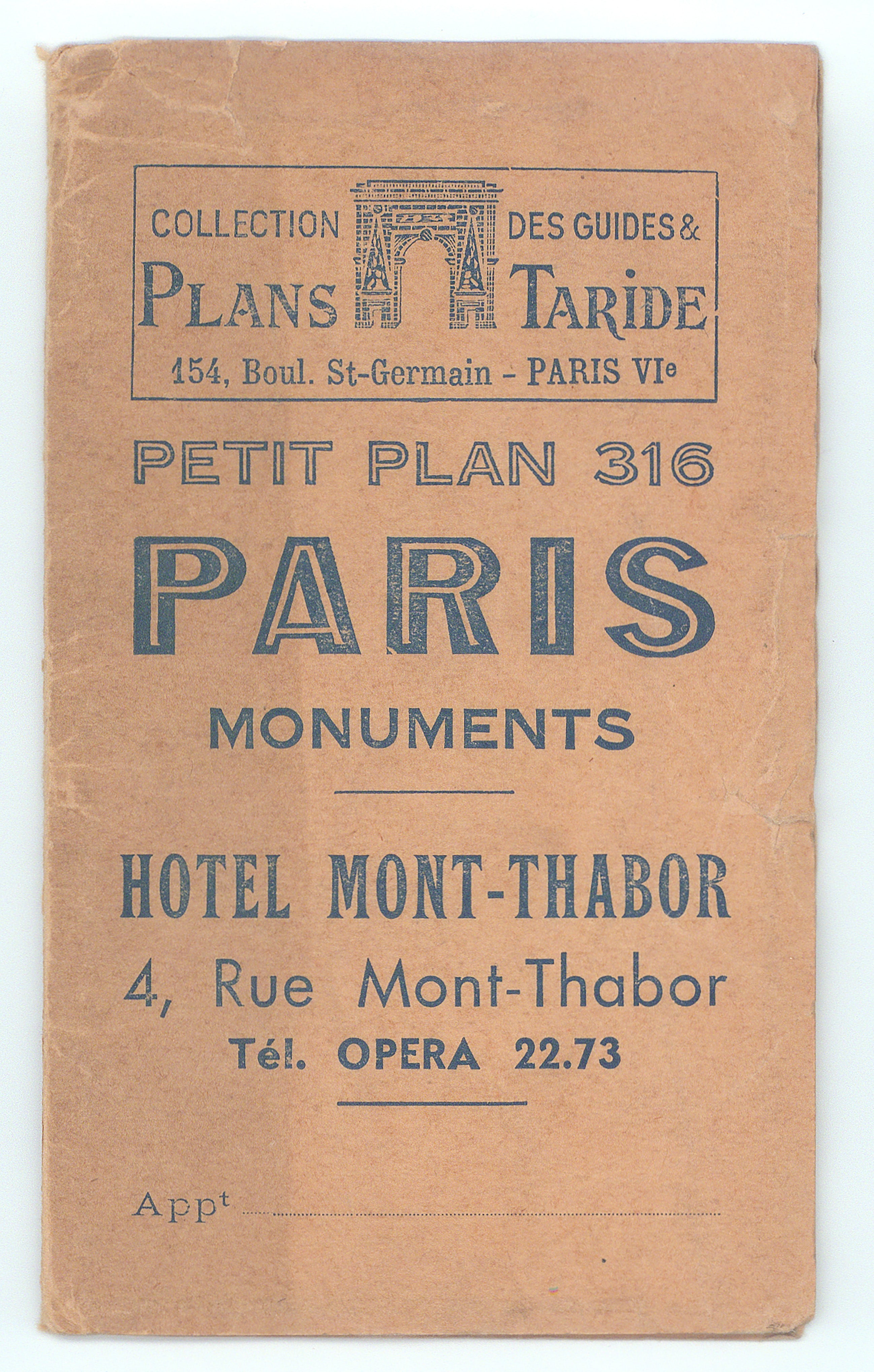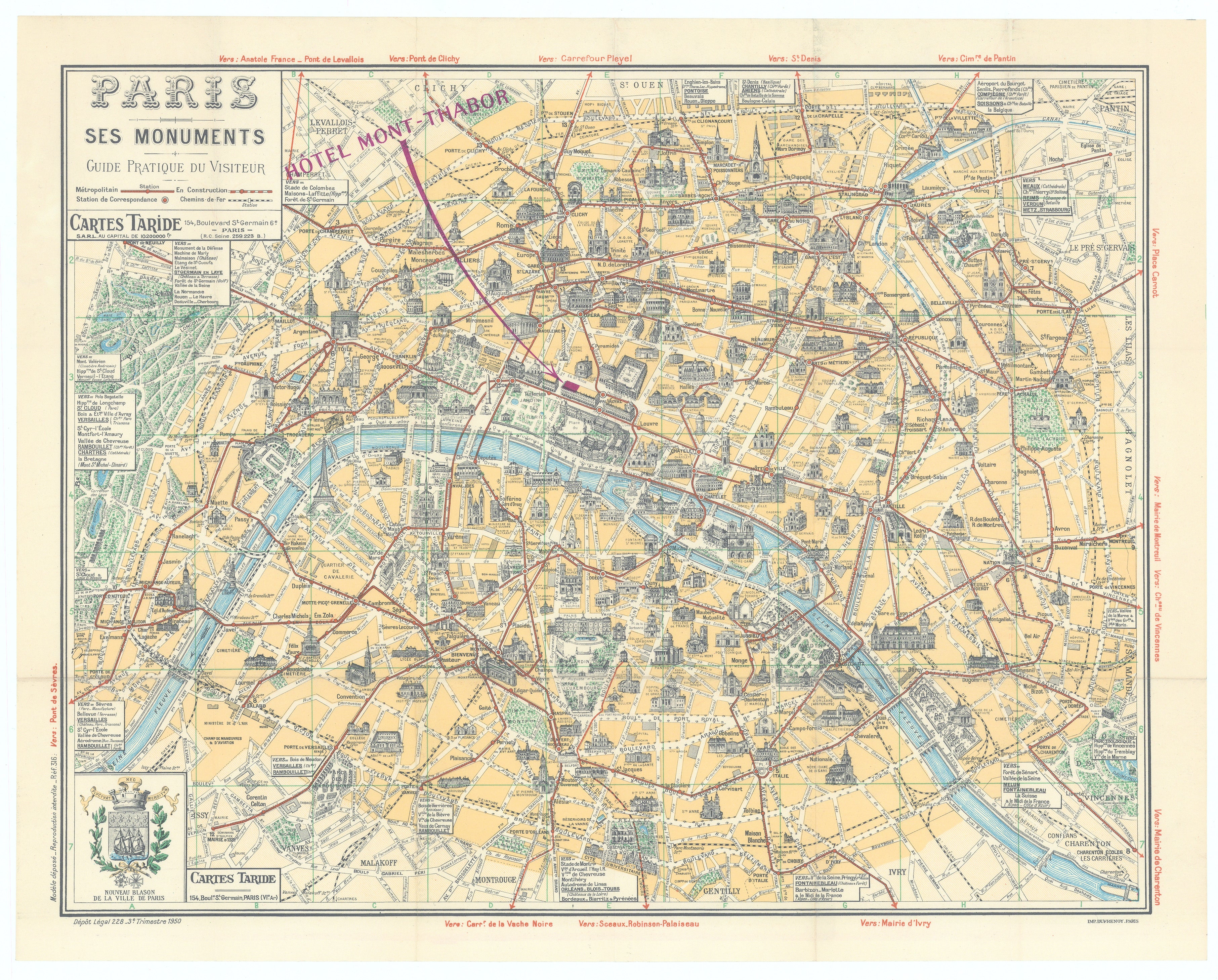 This 1950 illustrated tourist map of Paris showcases the city's monuments, streets, river, and key districts, using detailed pictorial representations and a soft color palette to guide visitors. The map features a prominent handwritten or printed highlight tracing the location of Hôtel Mont-Thabor, directing attention from the map's edge to its exact placement in central Paris. Streets, railway stations, metro stops, and famous landmarks such as the Eiffel Tower, Notre-Dame, the Louvre, and the Arc de Triomphe are clearly depicted and labeled, making it easy for tourists to orient themselves and plan their exploration. The map includes practical information, such as a legend for symbols and a publisher’s imprint, evoking the design style and touristic priorities of postwar Paris while serving as both a navigational aid and a visual souvenir of the era.