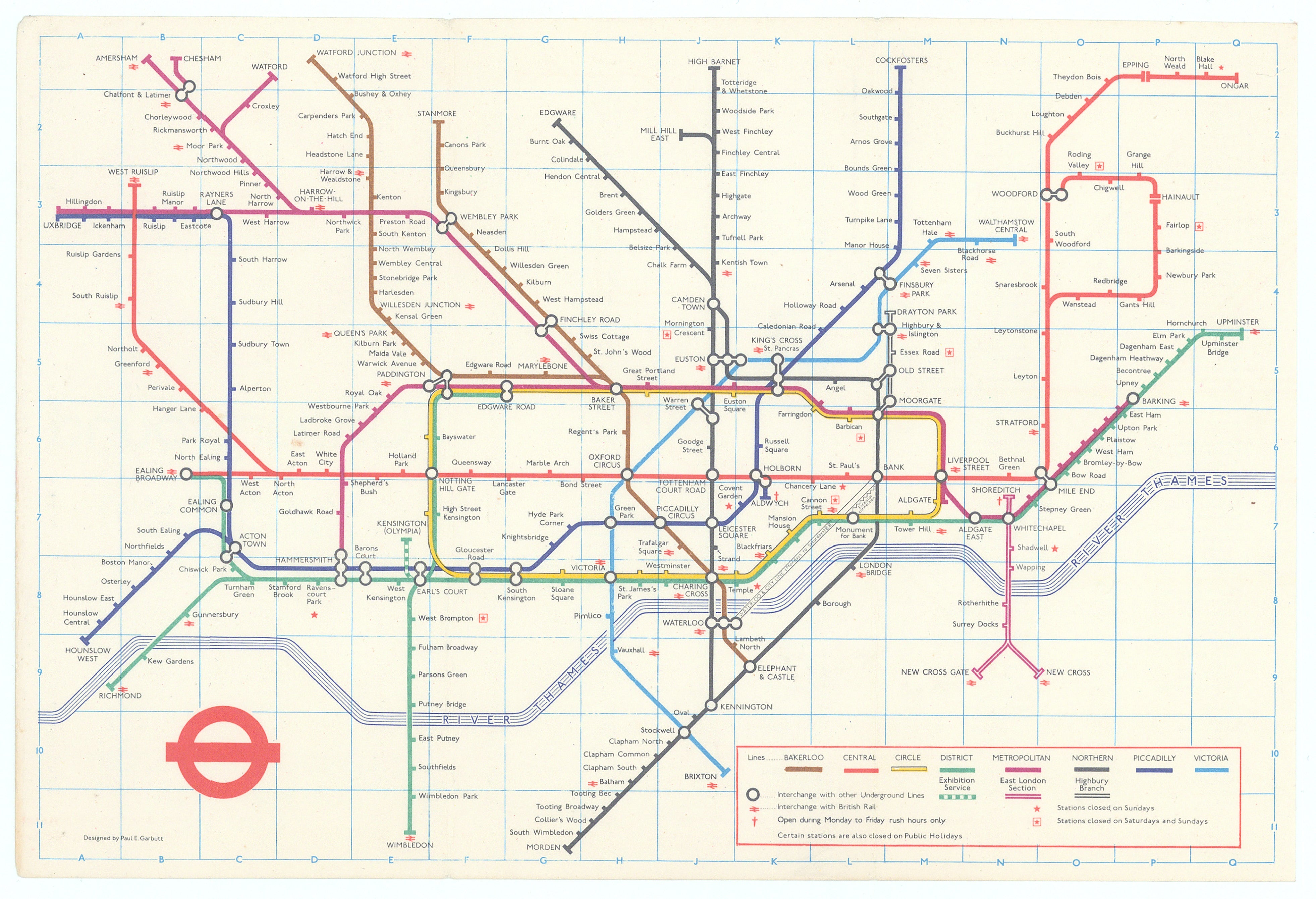 This expertly detailed map of the London Underground (Tube) was designed in the schematic style that became iconic for transport cartography in the 20th century. The map displays all principal Underground lines in London as of the early 1970s, each line color-coded and drawn with straight lines and gentle curves, rather than following the city’s actual geography—allowing for maximal clarity, legibility, and ease of use. Major interchange stations are denoted with distinctive symbols, and the map includes operational notes, such as limited services, station closures on Sundays and holidays, and special interchange points. Rivers, zones, and suburb termini are marked to help orient riders to the broader London context.