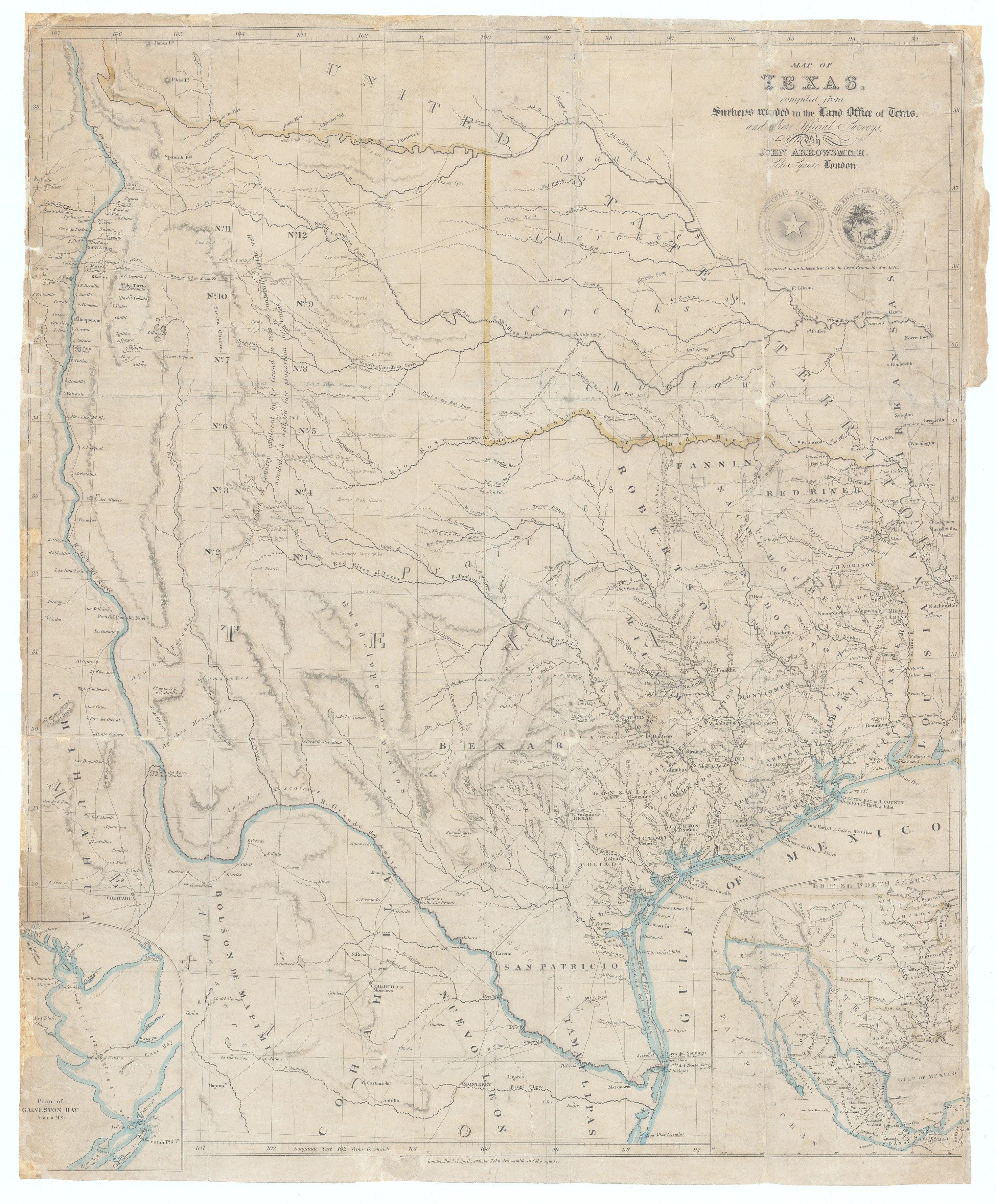 Arrowsmith explicitly cites the General Land Office of Texas and “other official surveys,” and he synthesized Texan government surveys, rival commercial maps, and travelers’ accounts into what was, for 1841, one of the most authoritative depictions available. The engraving is characteristically clean and elegant, typical for the Arrowsmith firm: fine line work, restrained but clear hachuring to suggest relief, and a spare title block, with no decorative vignettes to distract from the geographic information. Two inset maps being a plan of Galveston Bay and one of western North America from lower Canada to Central America with Republic of Texas outlined.