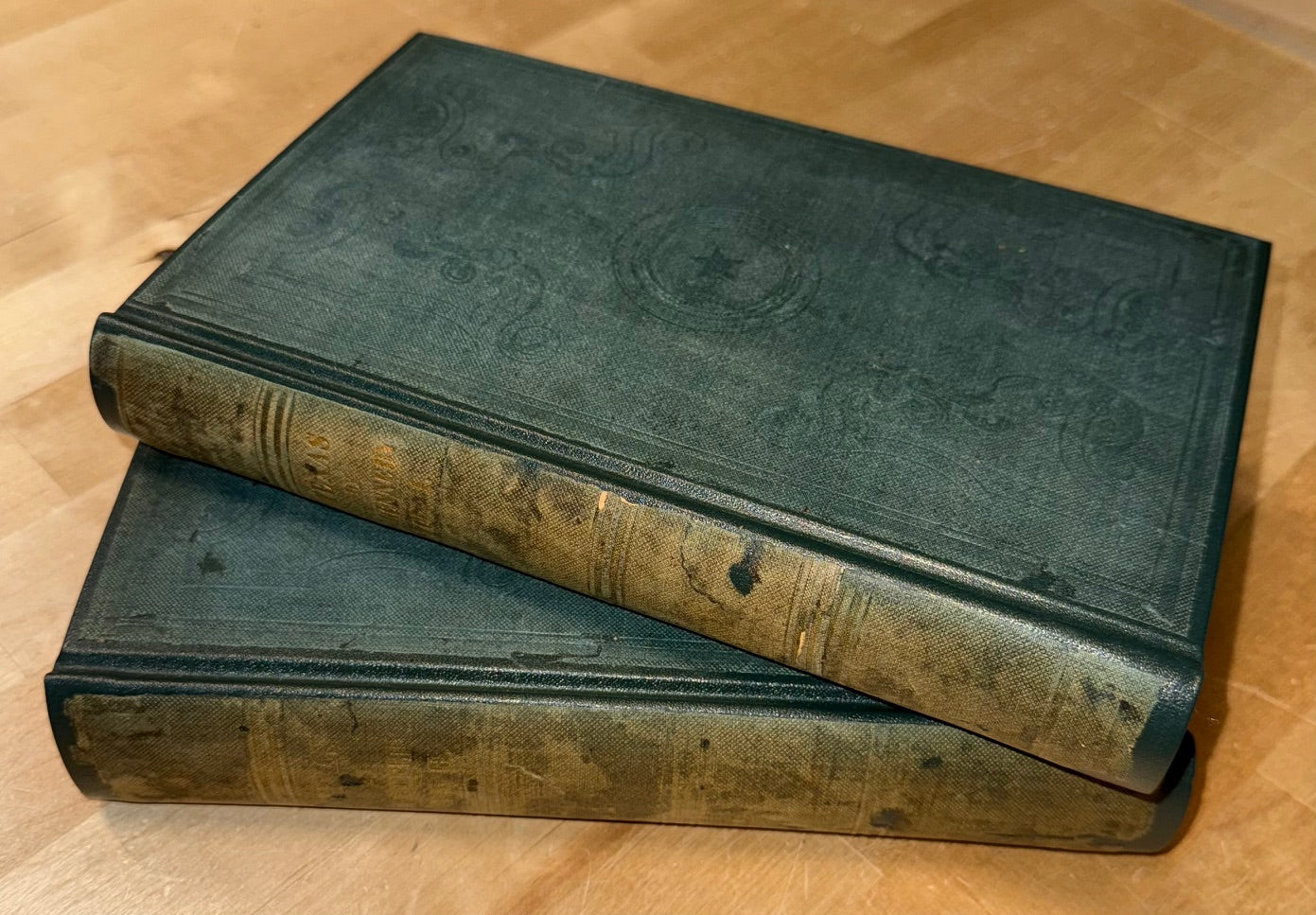 Text volumes with Explorers Club bookplate and occasional blind stamp in text.  Rebacked retaining publisher's green cloth blocked in blind, spines lettered gilt, yellow-coated endpapers.  Contents clean and bright with mild browning, occasional scattered staining, chipping to title page of and preliminaries of Vol. I, chipping to title page of Vol. II with no loss, tear 1.25 inch tear into page 280 Vol. I, just touching text.  Lacks maps.  Very good.  Map is from another volume.