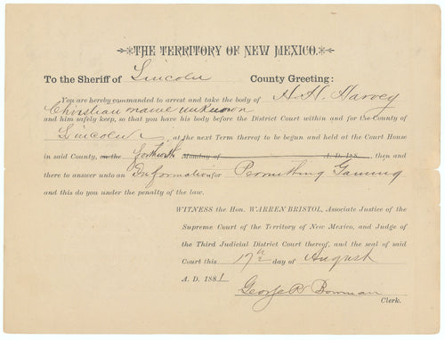 [Partially Printed Document Signed]: Pat F. Garrett, August 17th, 1881