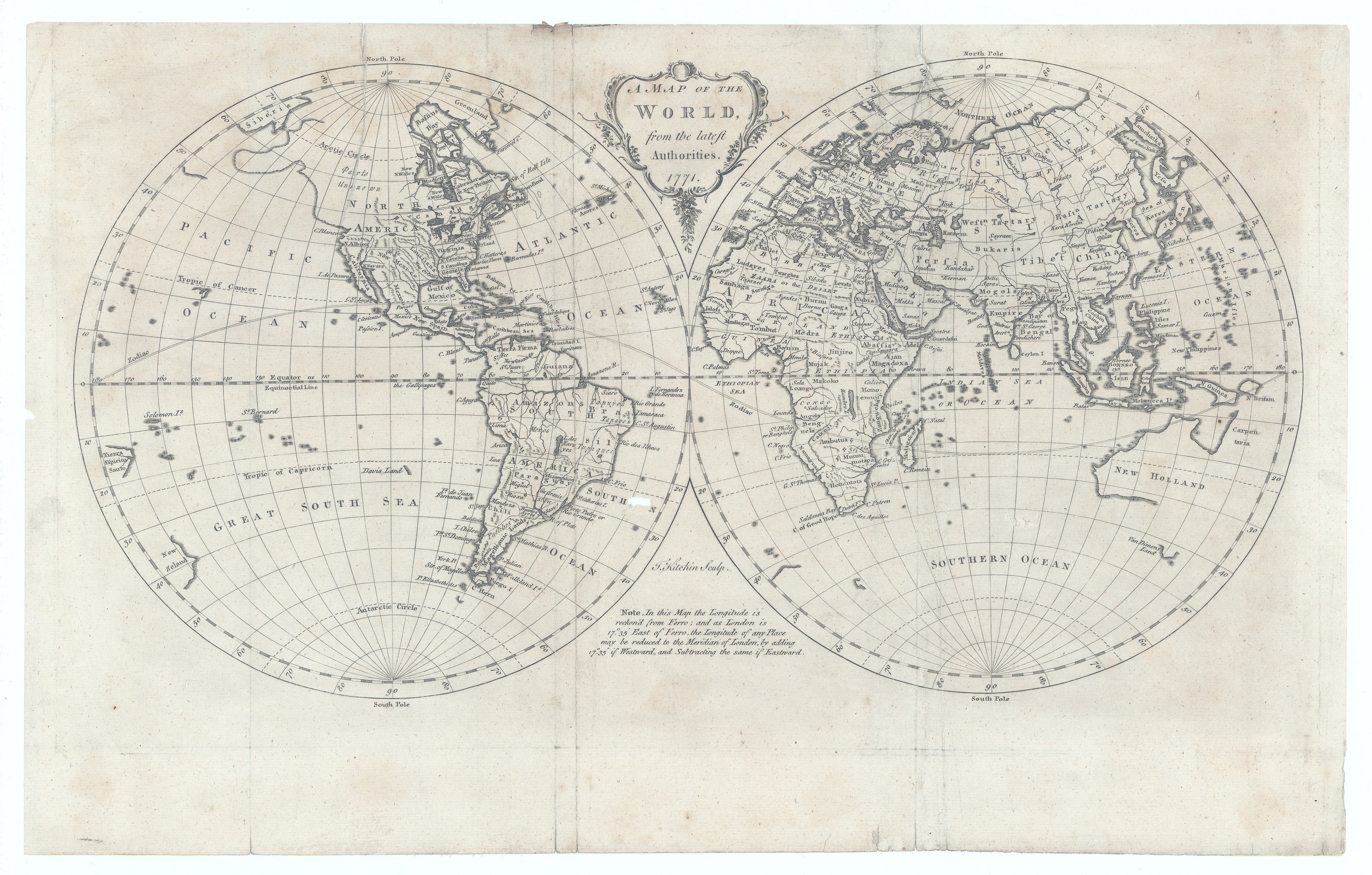 Supplementary elements—such as the tropics, polar circles, meridians of longitude measured from London, and notes on the choice of prime meridian—underscore the map’s didactic intent, reflecting Enlightenment ambitions to standardize geographic measurement and disseminate reliable cartographic knowledge. The central cartouche, positioned between the hemispheres, achieves a poised balance of ornament and clarity, exemplifying the refined aesthetic of late Georgian cartography while allowing the precision of the engraving and the density of the nomenclature to dominate the composition.