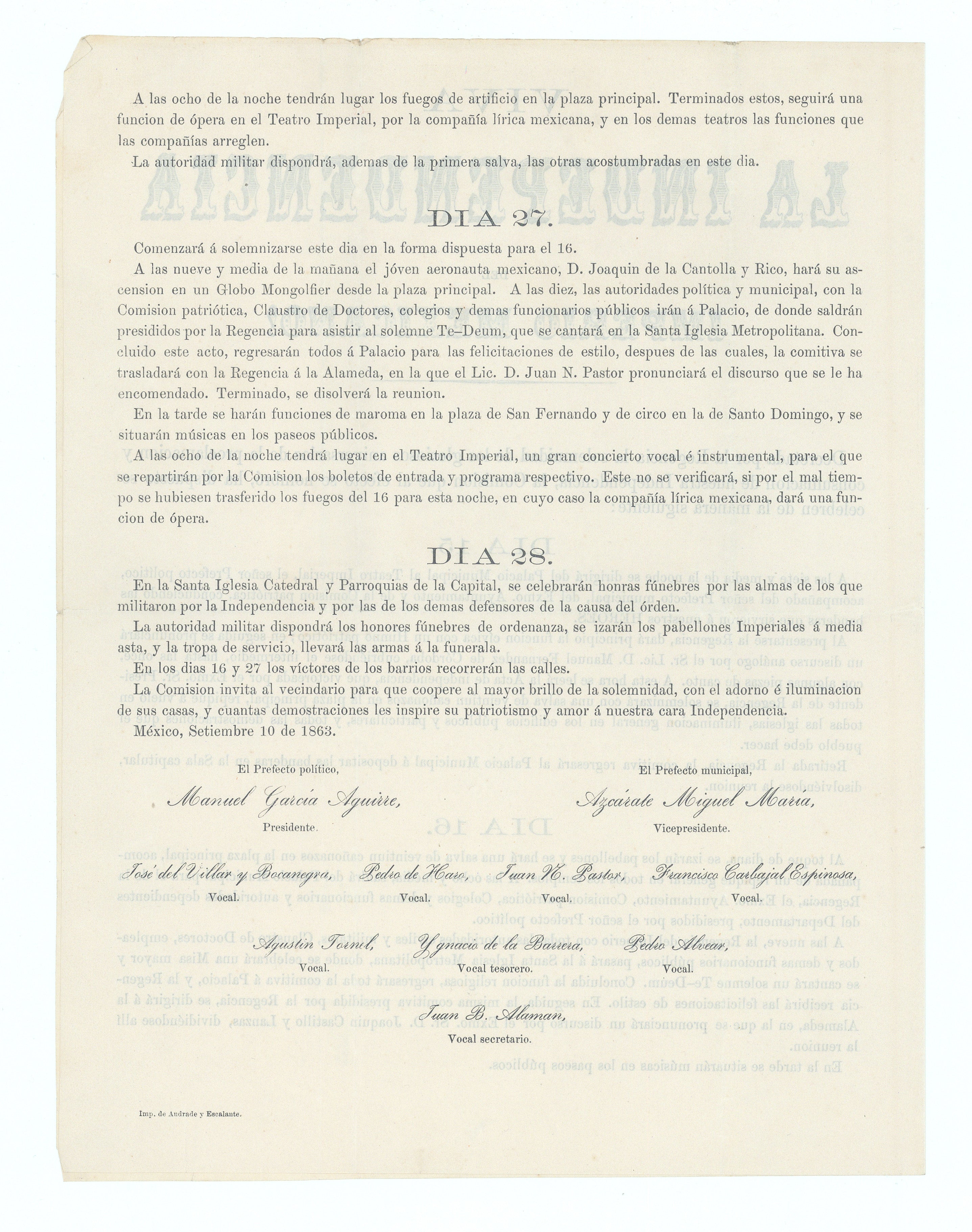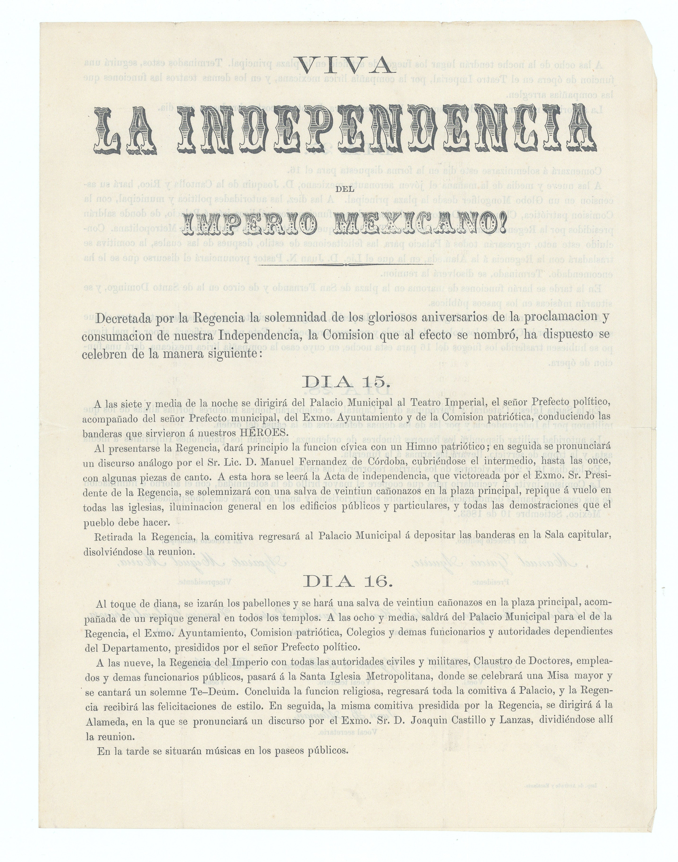 "Decreed by the Regency the solemnity of the glorious anniversaries of the proclamation and consummation of our Independence, the Commission that was named for this purpose, has arranged to be celebrated as follows ... At seven thirty at night it will go to the Municipal Palace to the Imperial Theater ... leading the flags that served our HEROES ... the civic function will begin with a patriotic hymn ... the Act of Independence will be read ... which will be solemnized with a salute of twenty-one cannon shots in the square principally, ring on the fly in all the churches ... and all the demonstrations that the people must make." Mexico, September 10, 1863.