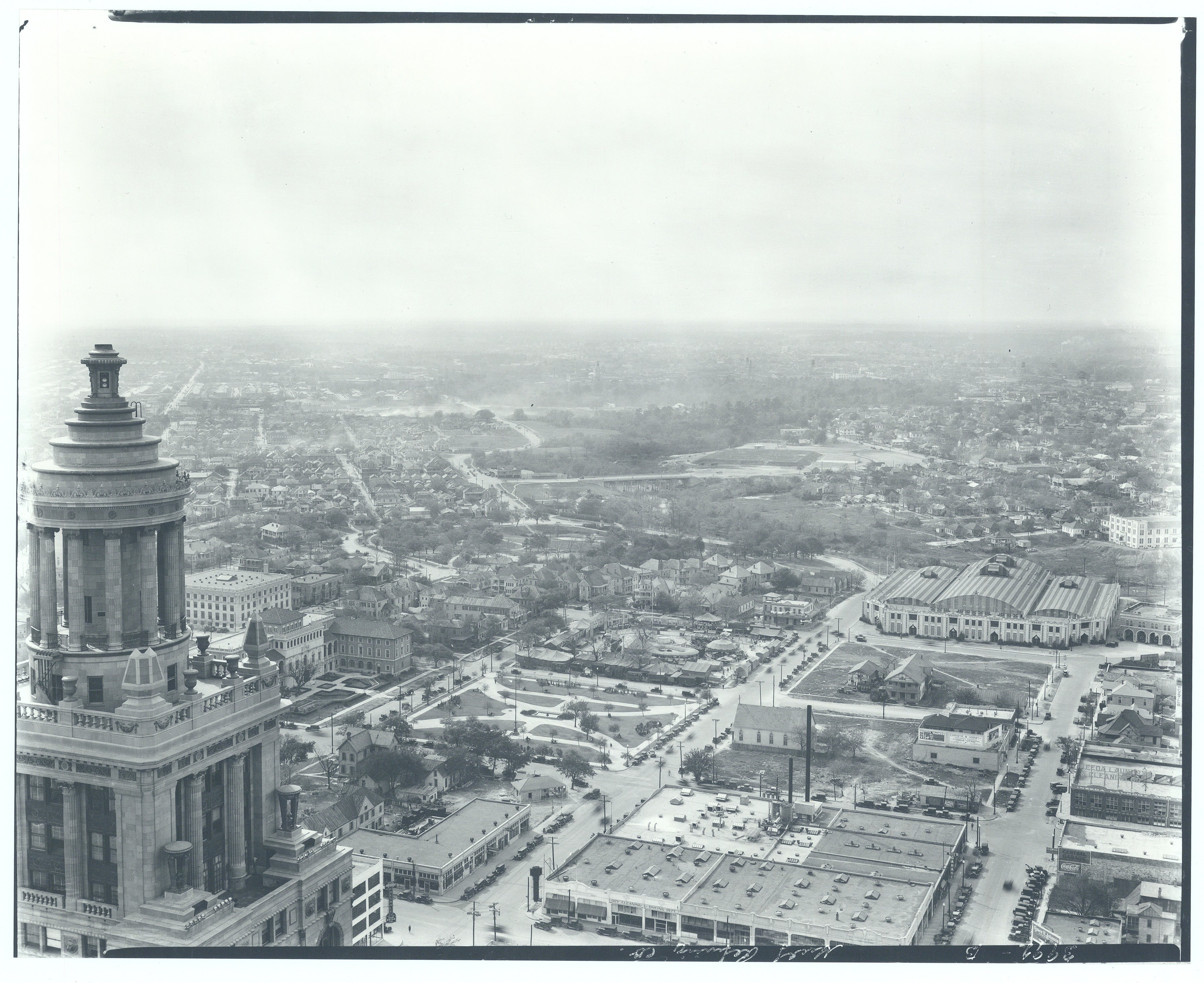This later printed photograph depicts downtown Houston, Texas around the early 1930s, as viewed from a high vantage point atop the Gulf Building, facing northwest toward the residential neighborhoods and green spaces beyond the central city. The striking architectural feature in the foreground is the crown of the Niels Esperson Building, while the striped-roofed Sam Houston Coliseum sits prominently at right, surrounded by early commercial storefronts, civic spaces, and scattered homes characteristic of the city’s transitional pre-war urban landscape.
