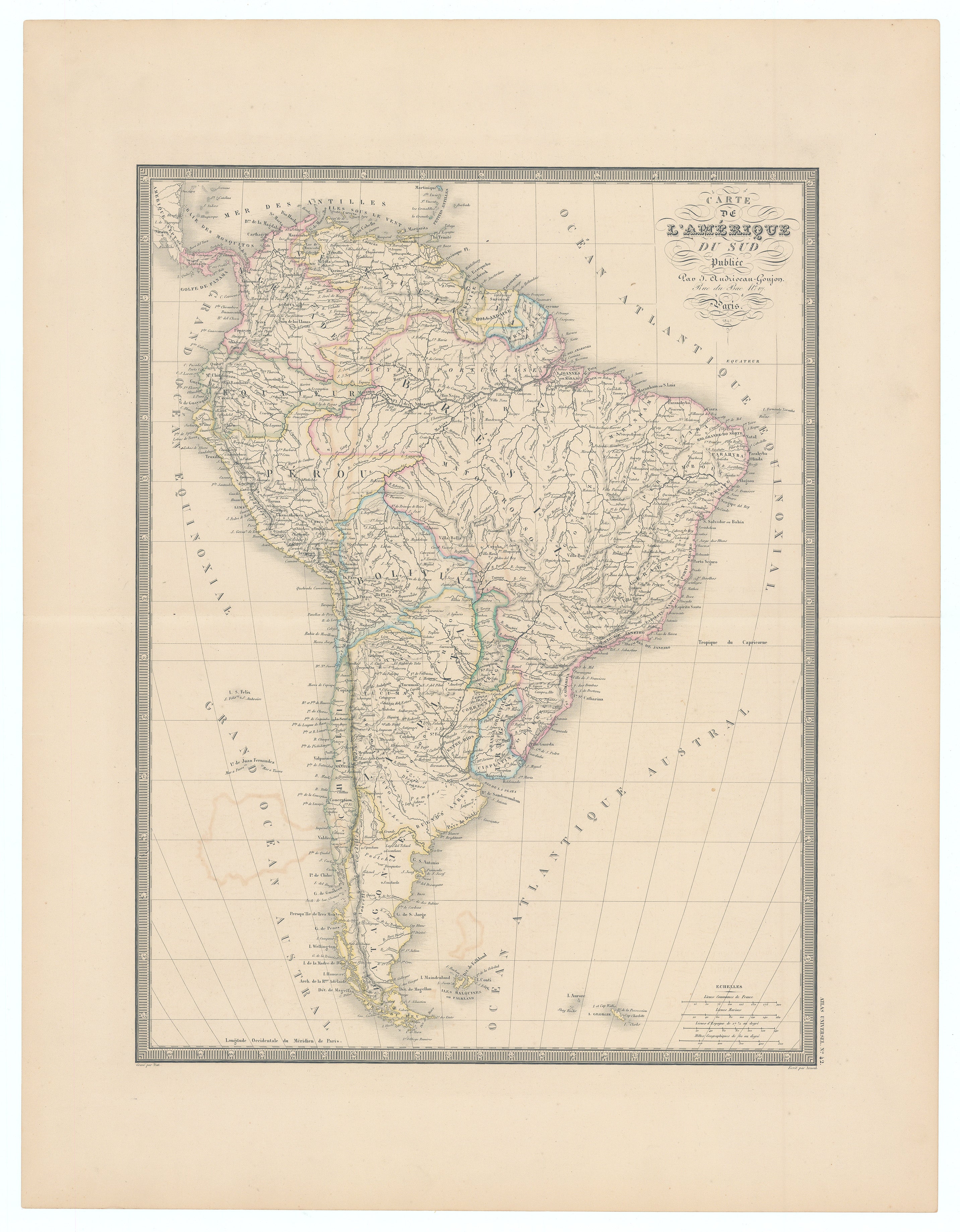 Additional features include a decorative, swash-lettered title cartouche, a precise latitude-longitude grid, and fine engraved lines, all characteristic of Andriveau-Goujon’s high-quality production standards. Place names are rendered in French, and political boundaries are accentuated with hand-applied coloring, helping to differentiate the newly independent republics of South America from former colonial possessions.