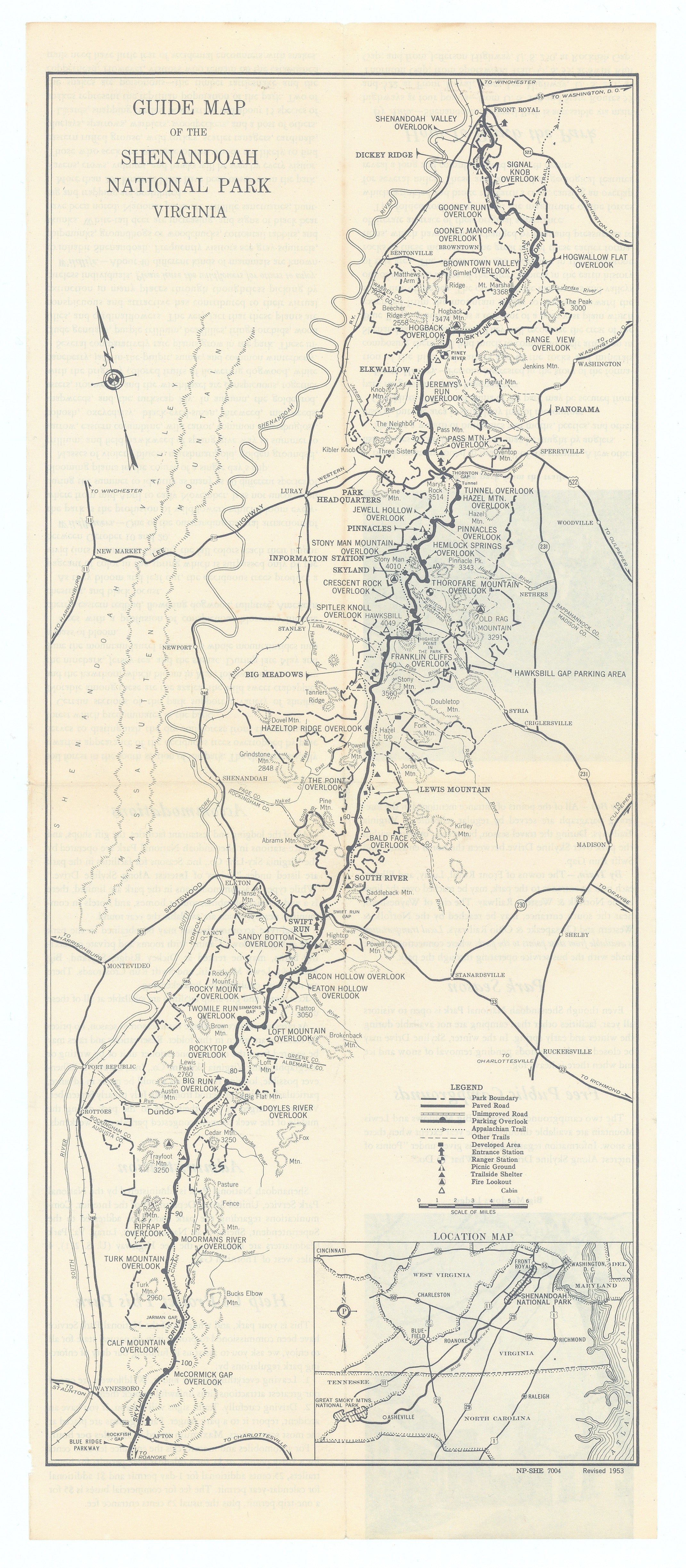 This mid-century National Park Service brochure for Shenandoah National Park in Virginia combines interpretive text, photography, and a vertically oriented guide map of Skyline Drive to promote scenic motoring and park stewardship. Along the Blue Ridge crest, it names overlooks, campgrounds, and facilities with a simple line-symbol legend and including an inset location map situating Shenandoah in relation to surrounding states and major highways, all dated as a 1953 revision.