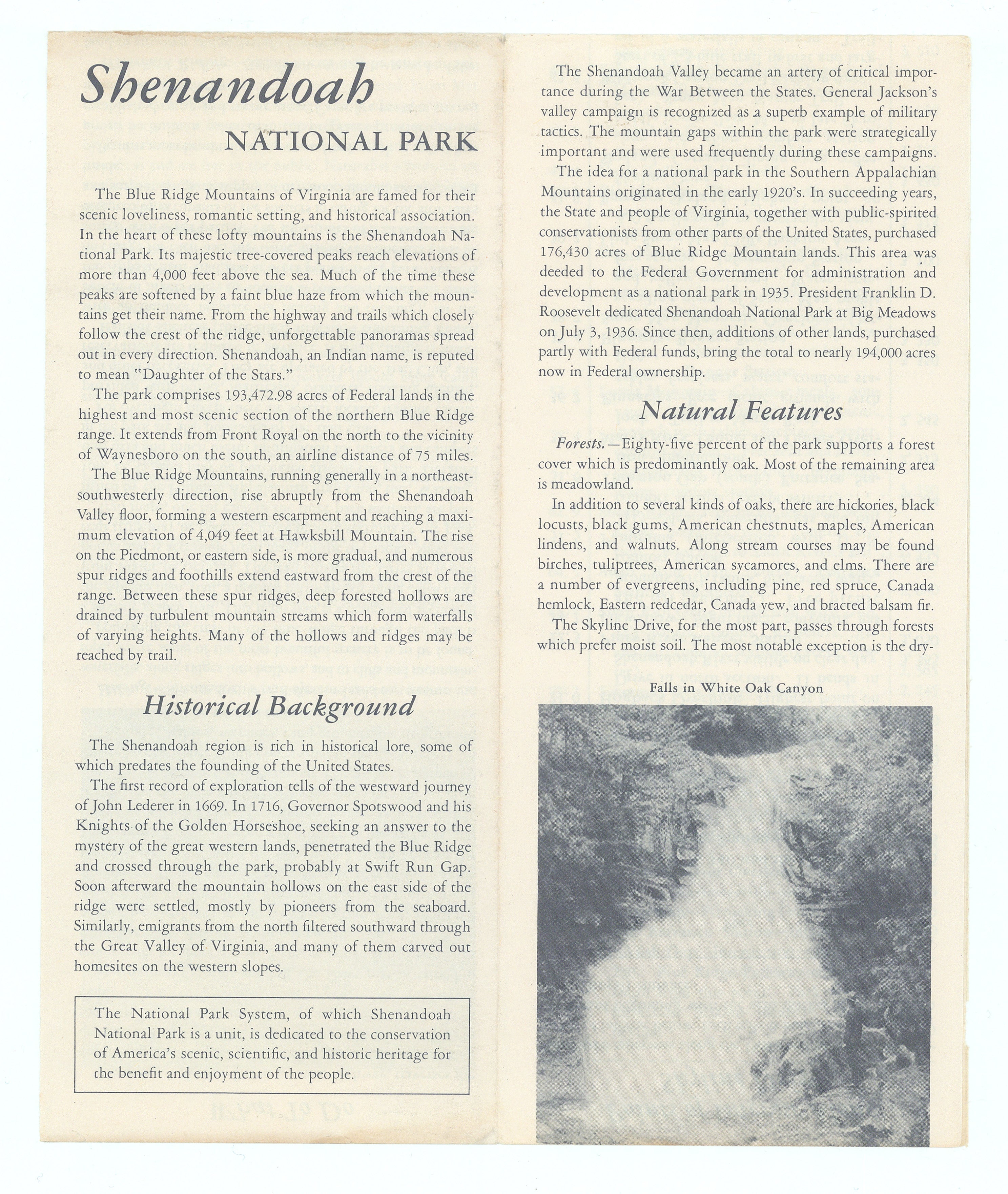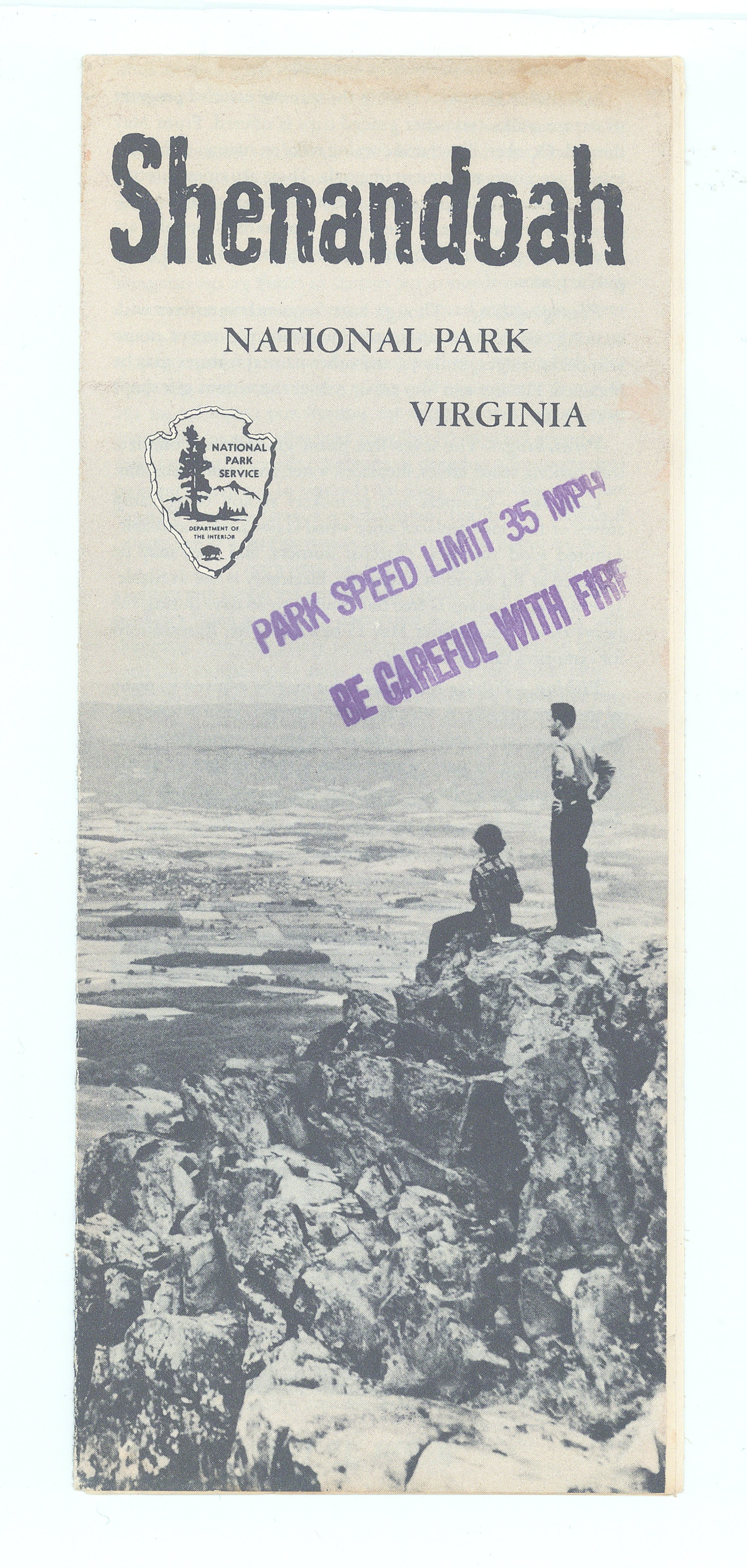 The front cover features a monochrome photograph of visitors looking out from a rocky overlook across the Shenandoah Valley, overprinted with safety slogans about the 35 mph park speed limit and fire caution, while the interior panels provide descriptive essays on the park’s landscape, history, and natural features in a classic serif typeface.