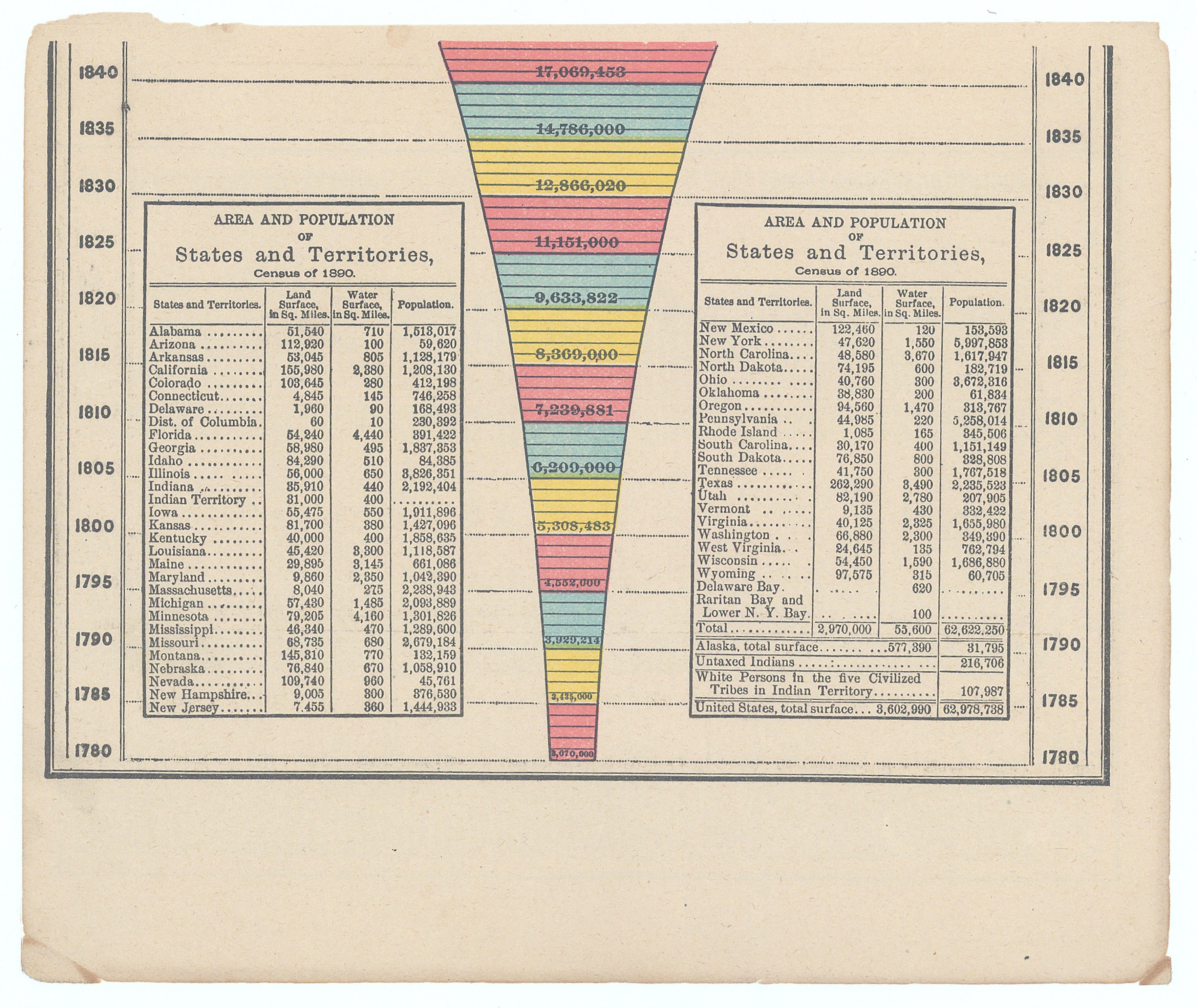 This small but detailed chart shows the area and population of U.S. states and territories from the 1820 and 1890 censuses. Two tables list land and water areas (in square miles) alongside population figures for each state and territory from each census year. In the center, a colored, funnel-shaped graphic visually compares total U.S. population growth at decade intervals from 1780 to 1840, with population numbers marked at each segment. The chart highlights the rapid increase and geographic expansion of the U.S. across the 19th century.