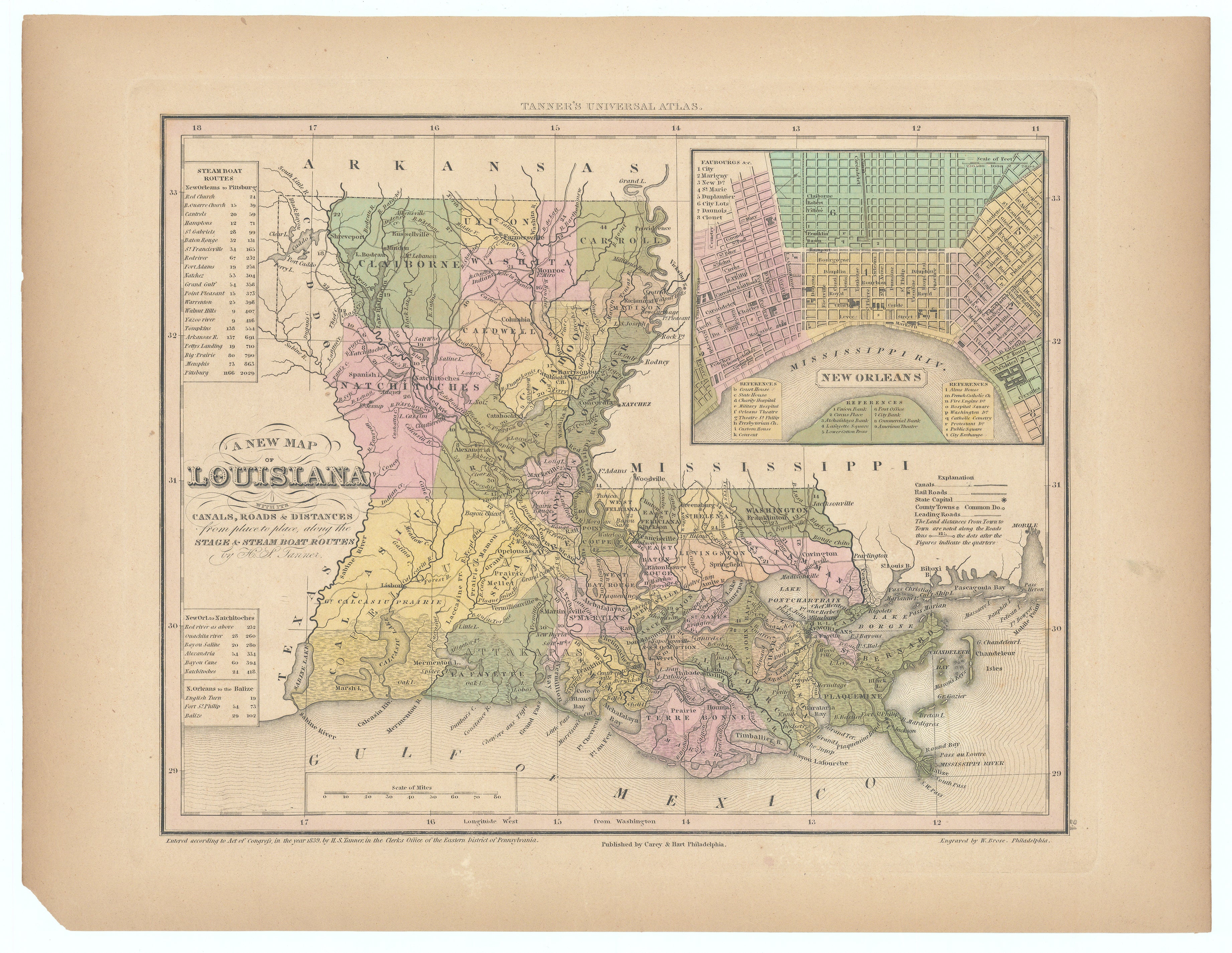 This highly detailed map features an inset of New Orleans, accompanied by a chart detailing steamboat routes and a list of distances from New Orleans to various cities. It illustrates major roads, both existing and proposed canals and railroads, wetlands, and the distances between towns. The map is from Henry S. Tanner’s "A New Universal Atlas Containing Maps of the various Empires, Kingdoms, States and Republics Of The World".