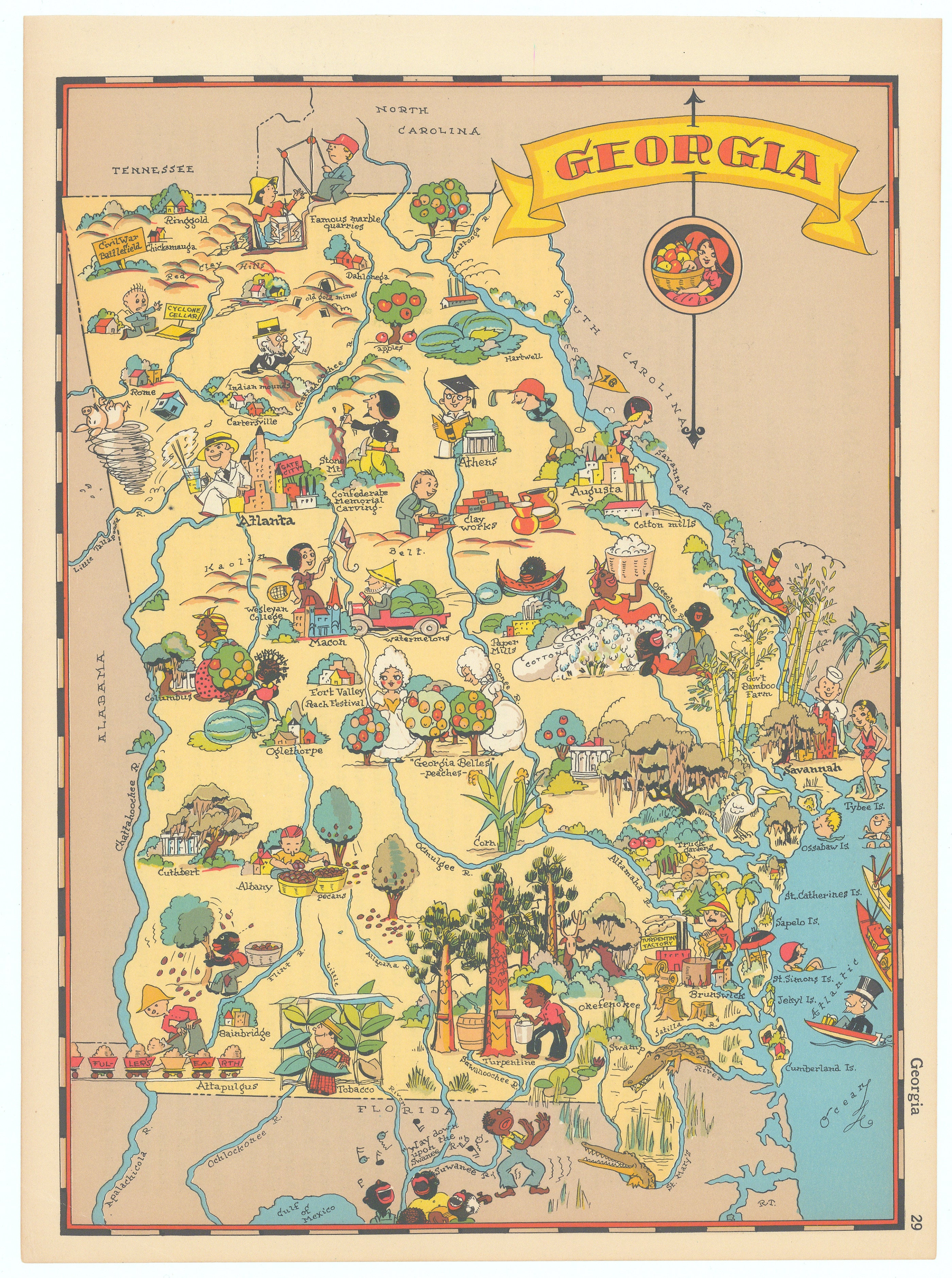 This map of Georgia is a vibrant pictorial “cartograph” published in Boston as part of her celebrated series for Our USA: A Gay Geography. The map is filled with whimsical illustrations and lively colors, depicting Alabama’s cities, agricultural products, historical sites, and local culture in a playful, engaging style.