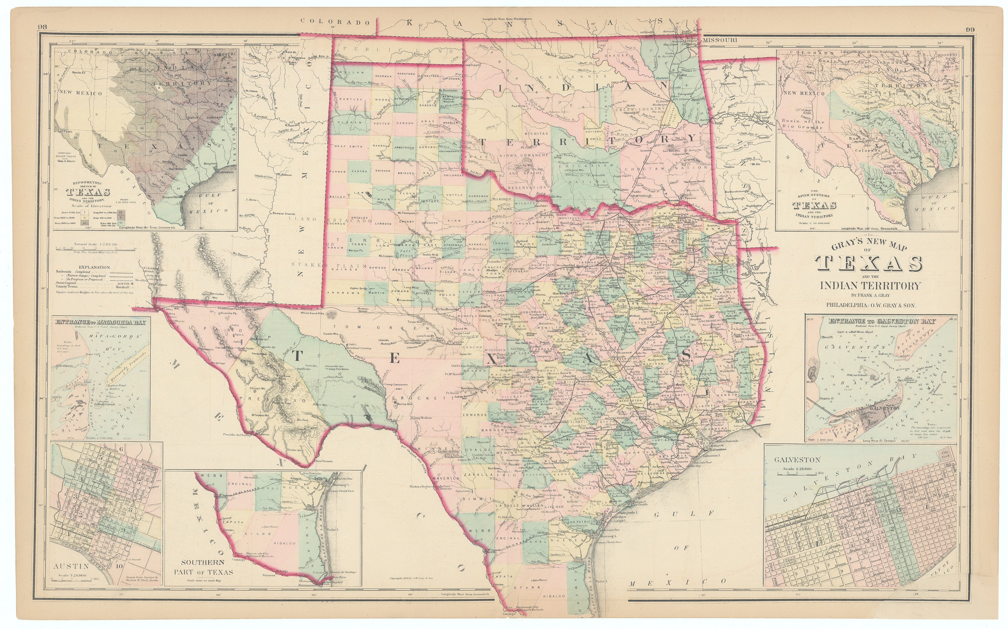 A large, highly detailed map of Texas and Indian Territory, with counties distinguished by color, as featured in Gray’s National Atlas. Inset maps feature a town plan of Austin, the entrance to Matagorda Bay, the entrance to Galveston Bay, a town plan of Galveston, and two additional inset maps of Texas.