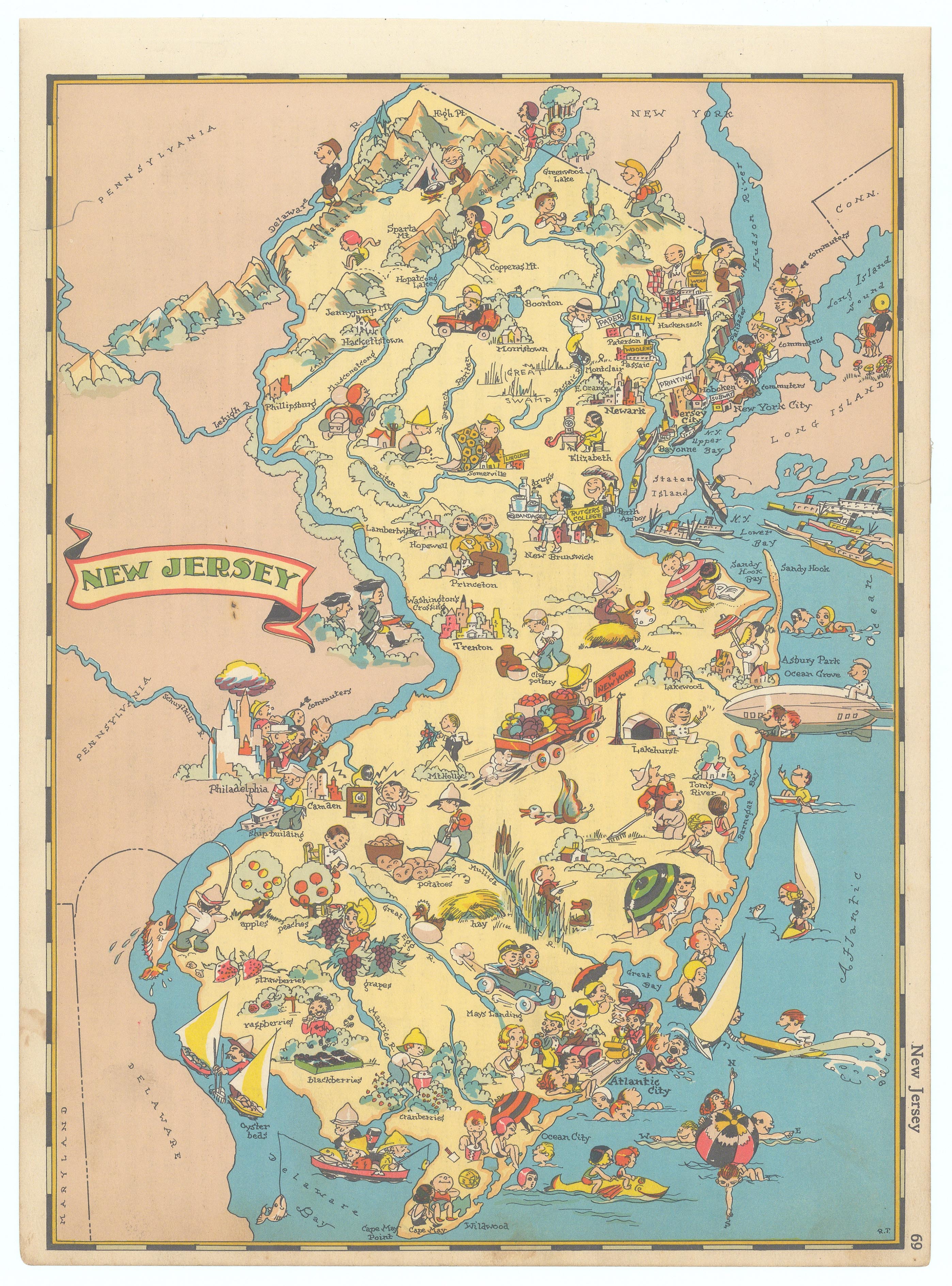 This map of New Jersey is a vibrant pictorial “cartograph” published in Boston as part of her celebrated series for Our USA: A Gay Geography. The map is filled with whimsical illustrations and lively colors, depicting Alabama’s cities, agricultural products, historical sites, and local culture in a playful, engaging style.