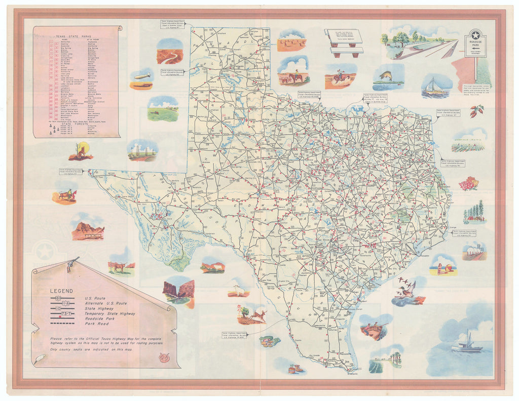 This user-friendly guide offers an in-depth overview of Texas’s state parks, state forests, and roadside parks, making it an invaluable resource for both residents and visitors. Clearly indicated transportation routes, as explained by the legend in the lower left, help travelers navigate, while 39 state parks and 5 state forests are distinctly numbered on the map for easy reference. Encircling the borders, engaging illustrations celebrate the state’s vibrant industries, recreational opportunities, and scenic landscapes.