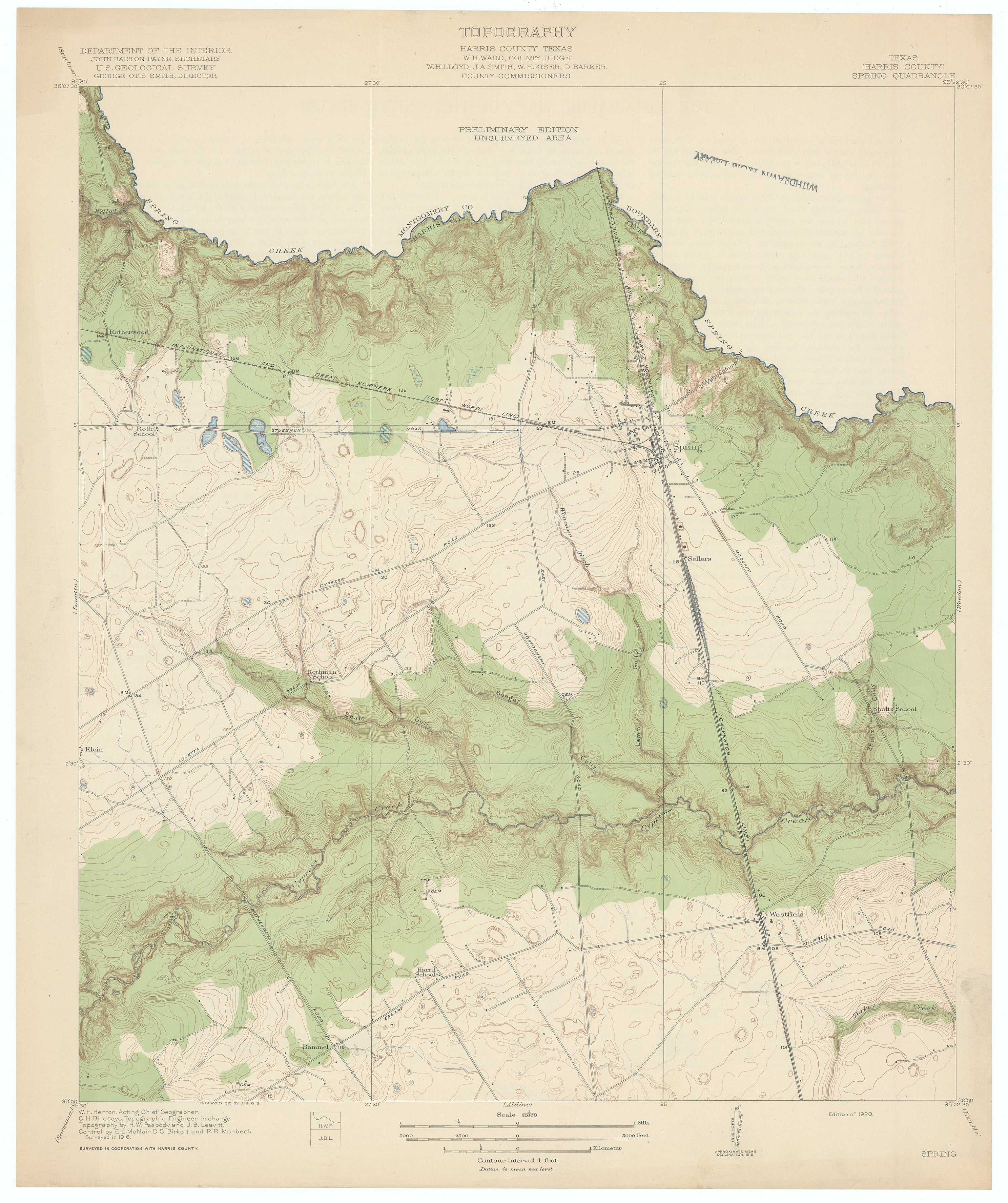 This topographic survey of the Spring Quadrangle in Harris County, Texas, produced by the United States Geological Survey (USGS) in cooperation with the state and local authorities. The map, labeled as a "Preliminary Edition" and "Unsurveyed Area," dates from the early 20th century and depicts the terrain, hydrography, and infrastructure of the region as it was at that time. Contour lines illustrate changes in elevation, with green shading denoting areas of woodland or brush and lighter tones indicating open land. The map details natural features such as creeks and valleys, as well as man-made elements including roads, railways, and scattered settlements. The northern boundary abuts Montgomery County, and the southern portion shows the approach to the community of Spring. The map’s scale is 1:62,500, providing a detailed representation suitable for land management, planning, and historical reference.